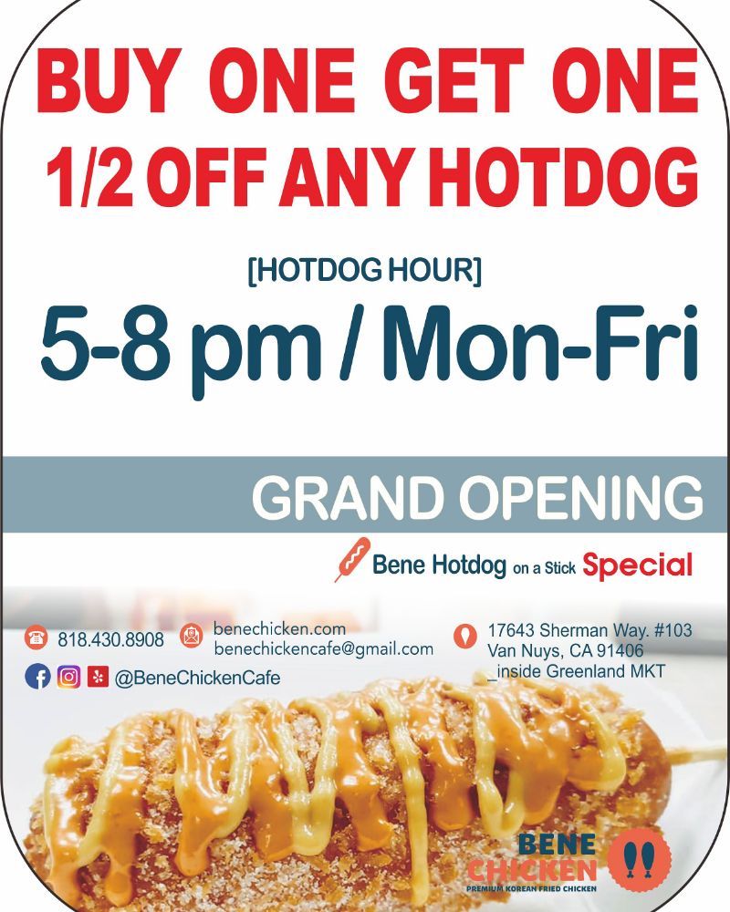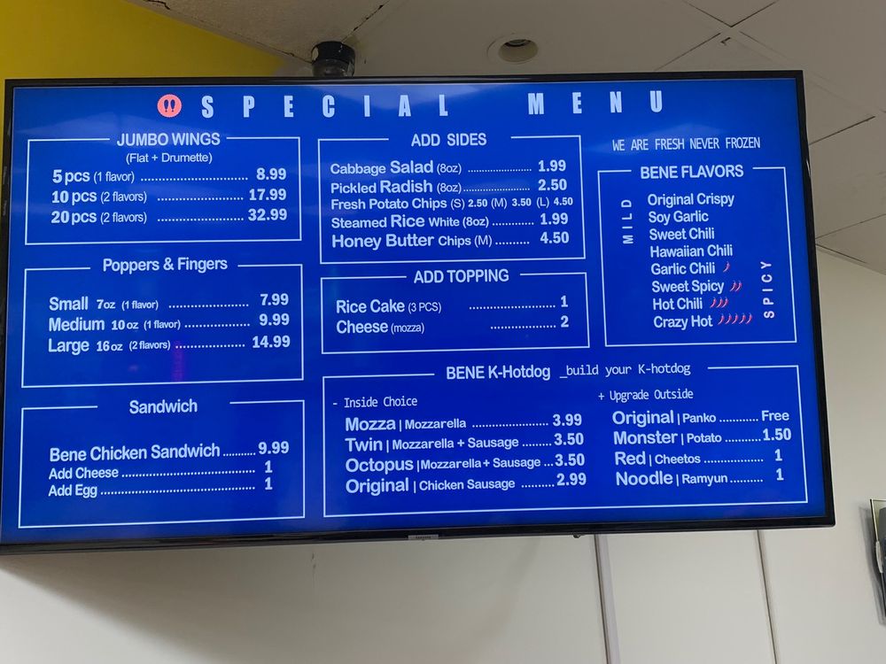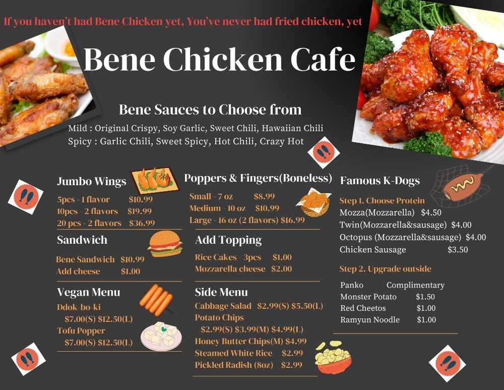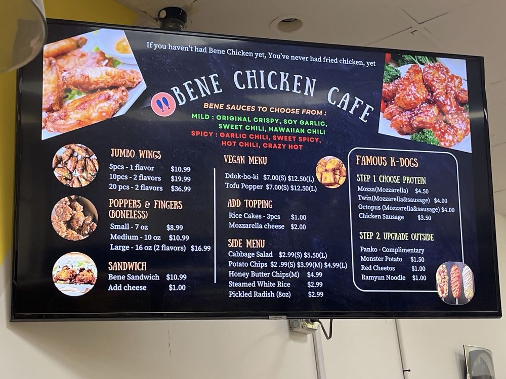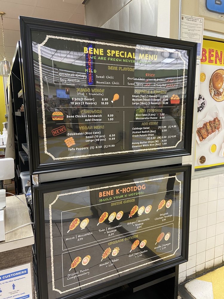 Welcome to Bene Chicken Cafe - 베네치킨, a delightful haven for food enthusiasts in Van Nuys, CA. Specializing in Korean-inspired hot dogs and mouthwatering chicken wings, Bene offers an impressive menu that caters to various tastes. Indulge in their signature Bene Korean Hotdogs, available in unique varieties like the Original and popular Monster dog, each crafted to tantalize your taste buds.
